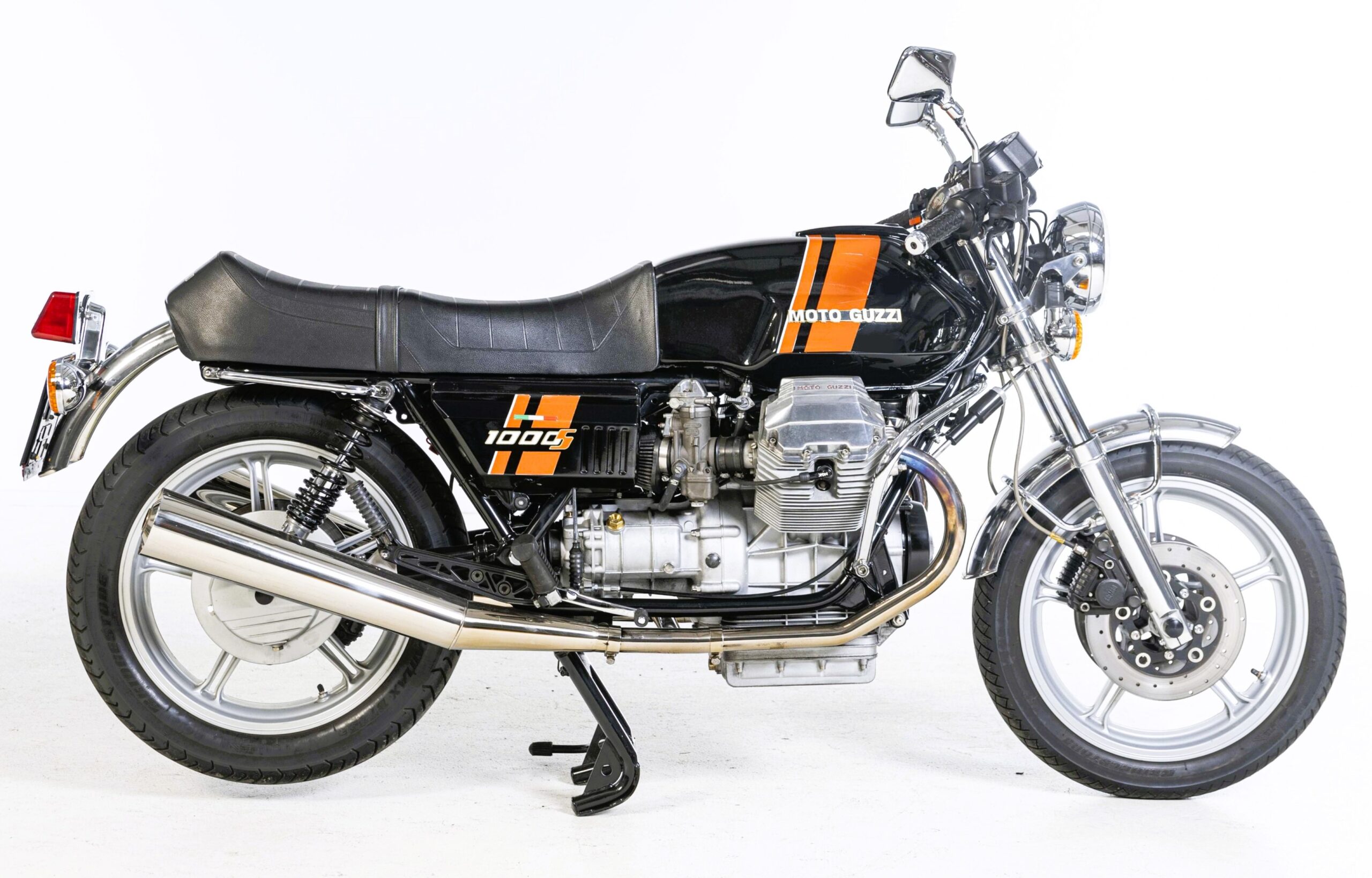 With its long wheelbase and narrow 100/90 V18 front and 120/90 V18 rear tyres, the Guzzi’s unshakeable stability is something to be experienced. It’s not the same fat-tyred solidity of modern bikes, more like the old riding-on-rails Âcliche Ducati 900SS feel. The suspension is taut, negating any hint of high-speed weaving, and the steering damper counters the efforts of potentially ‘bar-wrenching humps. The 1000S slides low, sucking up the arcing road and giving an adrenalin hit which seems to match its slow, deliberate handling. Wonderful!